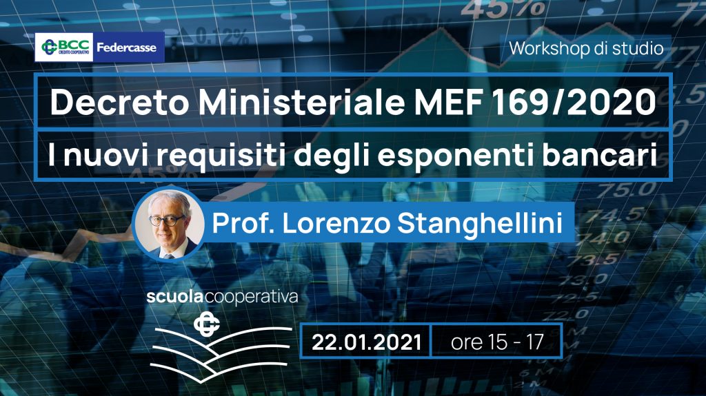 Banche Decreto Ministeriale MEF 169/2020 – I nuovi requisiti degli esponenti bancari La ScuolaCooperativa di Federcasse propone un Ciclo di Seminari online sul tema dei Requisiti e criteri di idoneità degli esponenti aziendali. 22 gennaio 2021